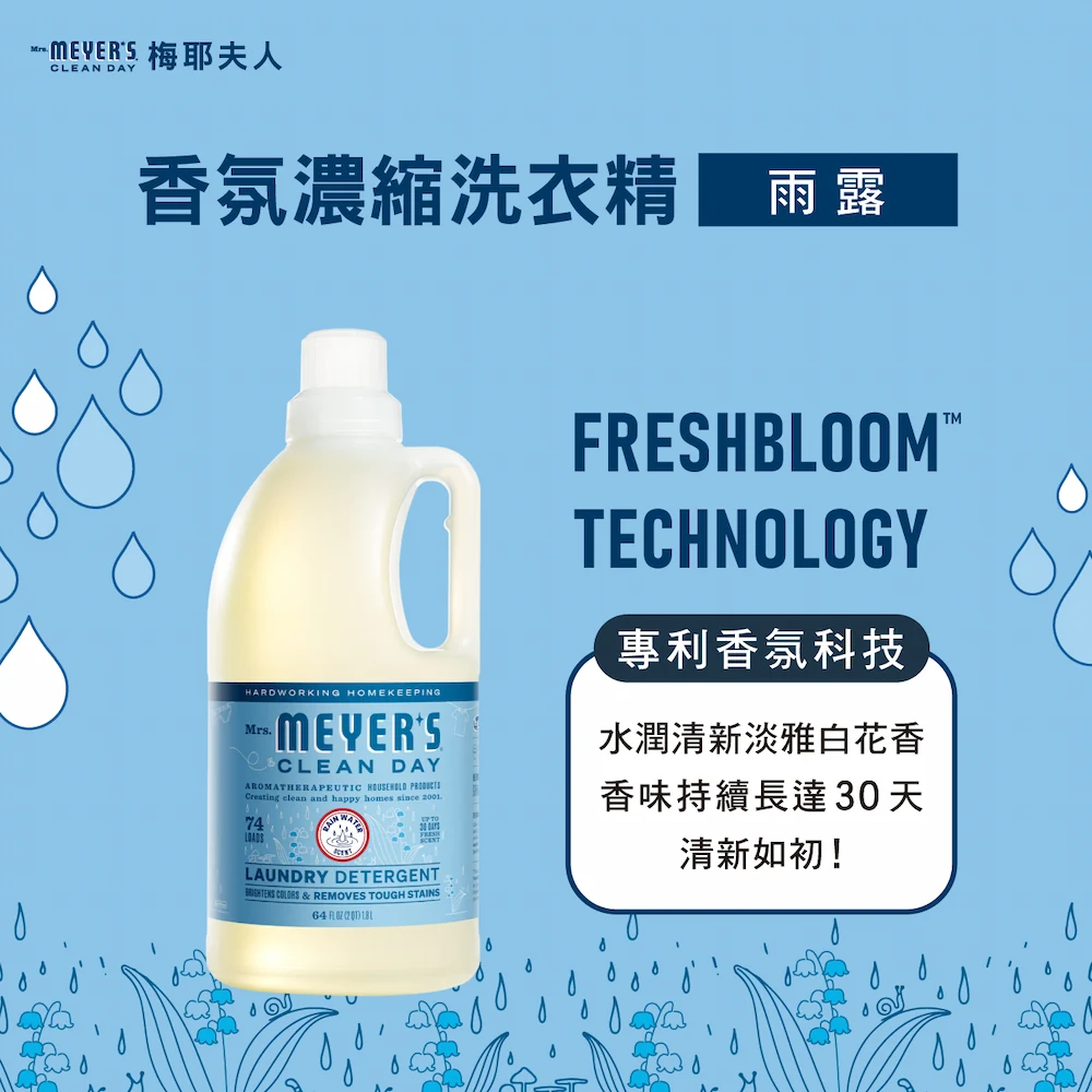 梅耶夫人獨特的雨露香氛濃縮洗衣精,氣息清新潔淨。高濃縮配方添加抗污與去漬酵素,溫和潔淨增豔亮澤衣物顏色。採用專利 FreshBloom™ 技術,讓衣物保持清新香氣。