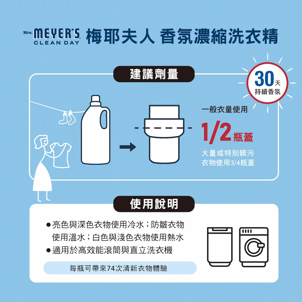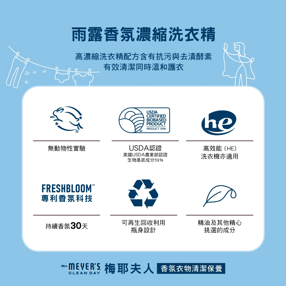 Mrs. Meyer’s Clean Day 梅耶夫人雨露洗衣精,散發純淨清新的氣息,如雨滴落在葉片與鼻尖,盈滿整個空氣。濃縮配方能有效去除髒汙與污漬。可生物分解配方的衣物香氛濃縮洗衣精,適用於直立與滾筒洗衣機,每瓶可搭配約74次洗衣使用。
