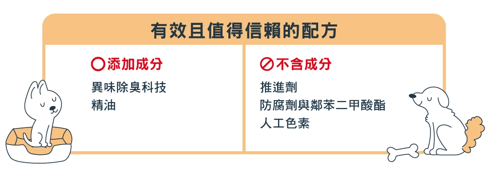 結合除臭技術與精油,從源頭對抗寵物氣味與異味,而非僅僅以香味掩蓋。