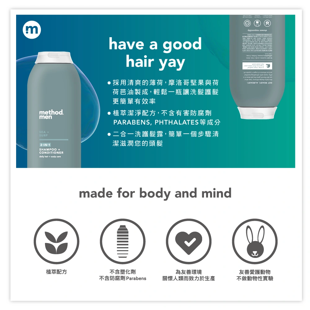 - 英文品名:Method Men 2-in-1 Shampoo + Conditioner Sea + Surf