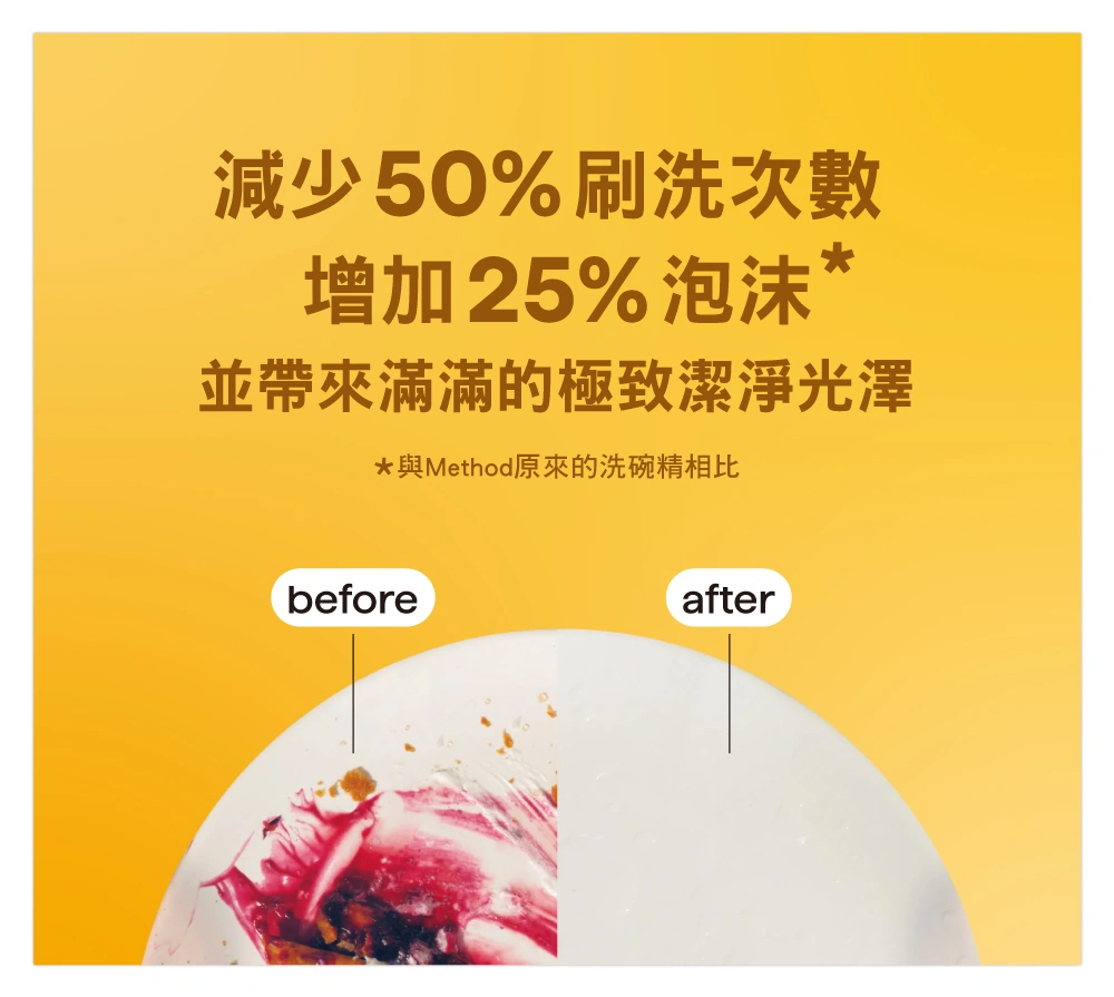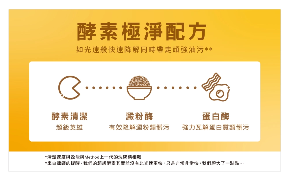 - 酵素潔淨力 採用酵素配方,有效去除高達99%油污,減少50%刷洗力道,同時提升25%泡沫量*