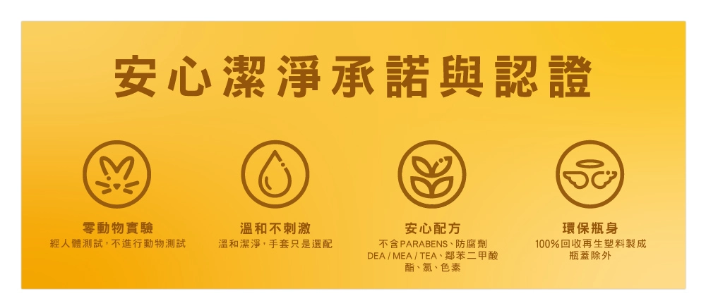 蛋白質 → 蛋白酵素(Protease) - 強效潔淨 + 溫和親膚 溫和不刺激雙手,洗碗可不需戴手套,產品不含 Parabens、Phthalates、Phosphates、DEAs、人工色素,無動物實驗(cruelty free)