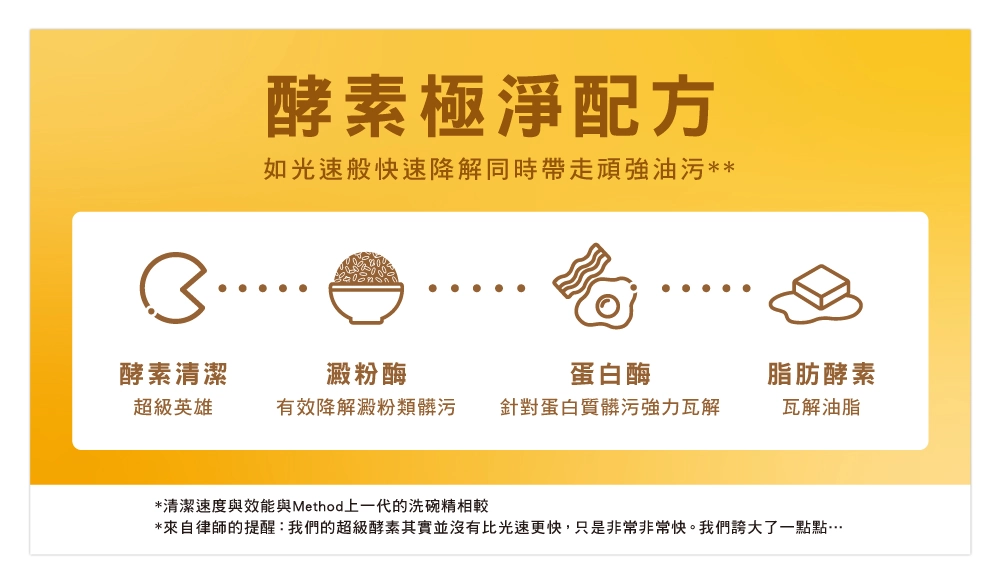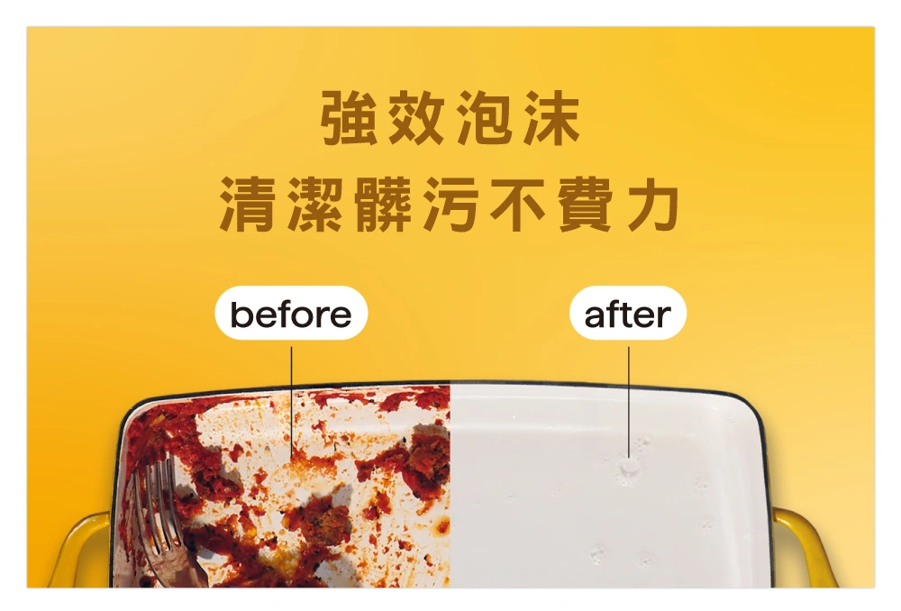 - 酵素潔淨力 採用酵素配方,有效去除高達99%油污,減少50%刷洗力道,同時提升25%泡沫量*