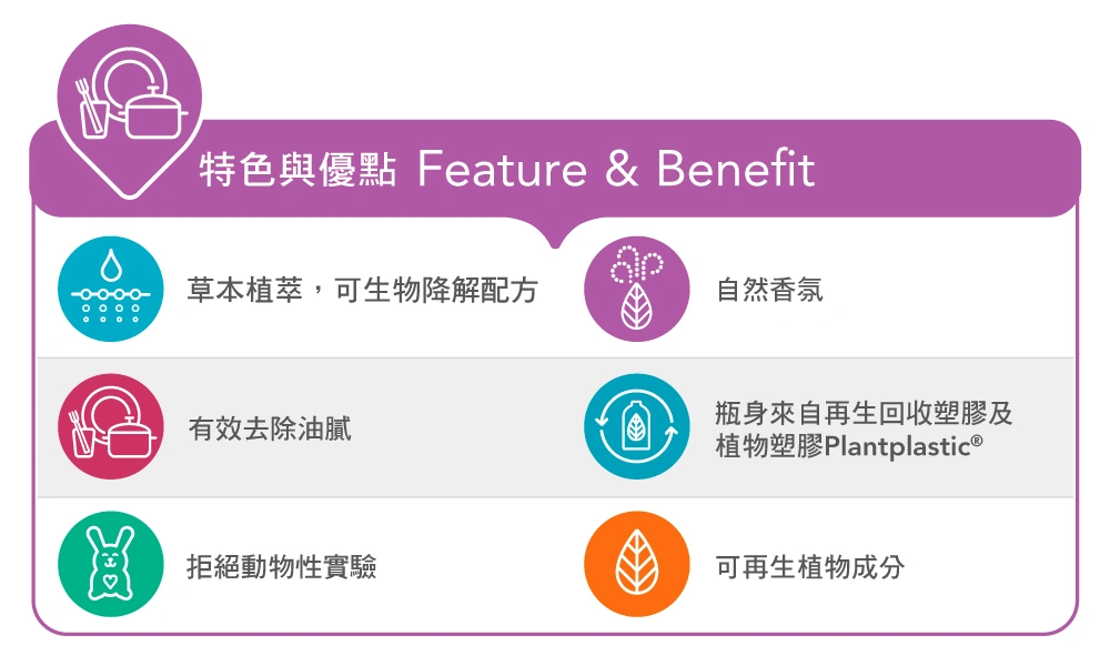 適合敏感肌膚使用,最新去油膩配方,全新包裝及配方,清潔效力更有效,去除碗盤油汙,晶亮不留痕跡。溫和草本植物與礦物配方,可生物降解,嚴格對待碗盤上殘留的食物殘渣,溫和對帶你的肌膚和地球,面對滿滿洗碗槽的碗盤只需要輕輕一擠壓即可!