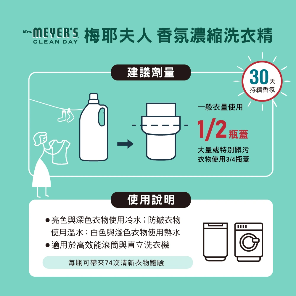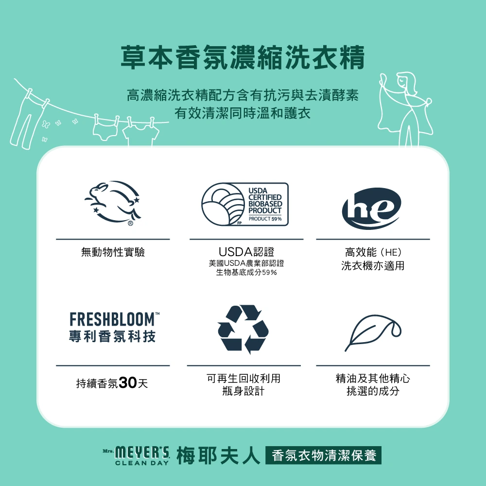 Mrs. Meyer’s Clean Day 梅耶夫人草本香氛濃縮洗衣精,散發純淨柔和的花香,草本氣息優雅而安心,療癒又令人愉悅。濃縮配方能有效去除髒汙與污漬。可生物降解配方的衣物香氛濃縮洗衣精,適用於直立與滾筒洗衣機,每瓶可搭配約74次洗衣使用。